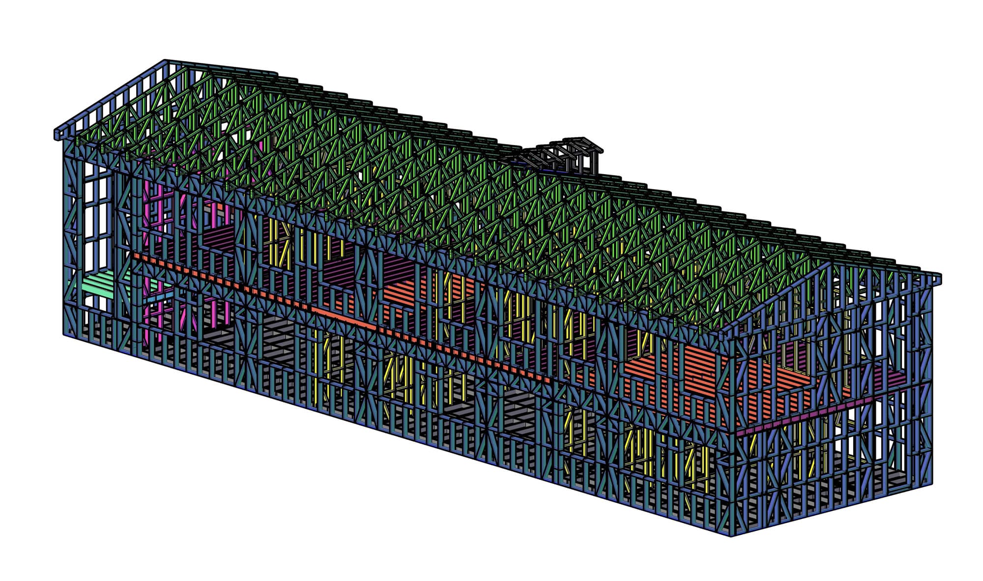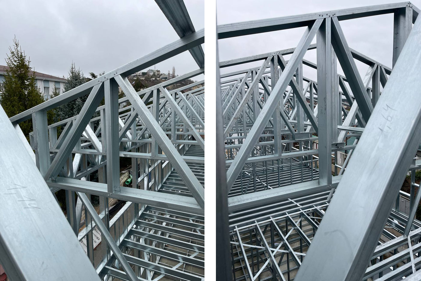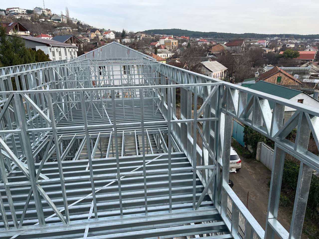 Перекрытие над вторым этажом — двускатные стропильные фермы. Обрешётка по верхнему поясу ферм с шагом 500 мм под металлические профилированные листы.