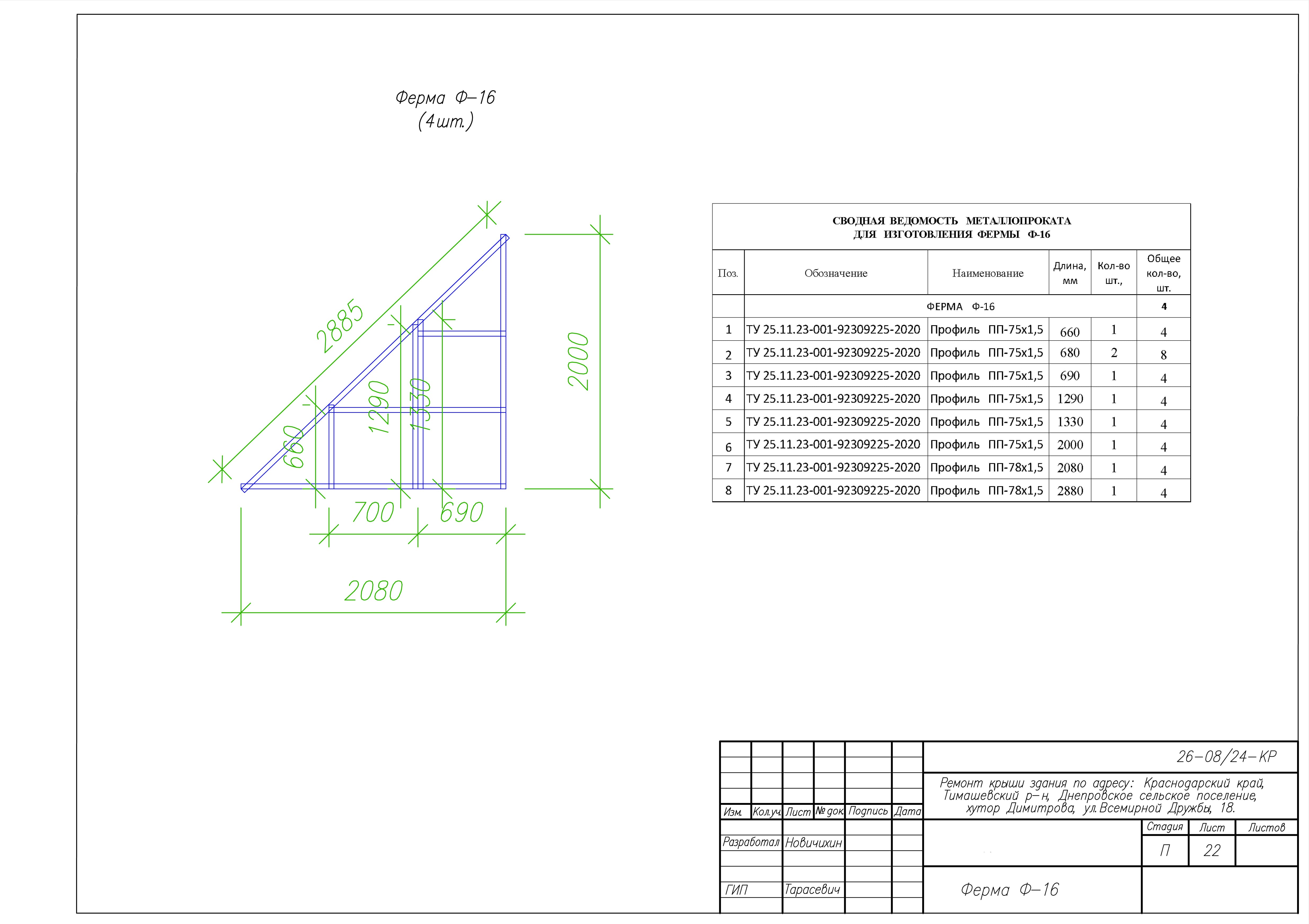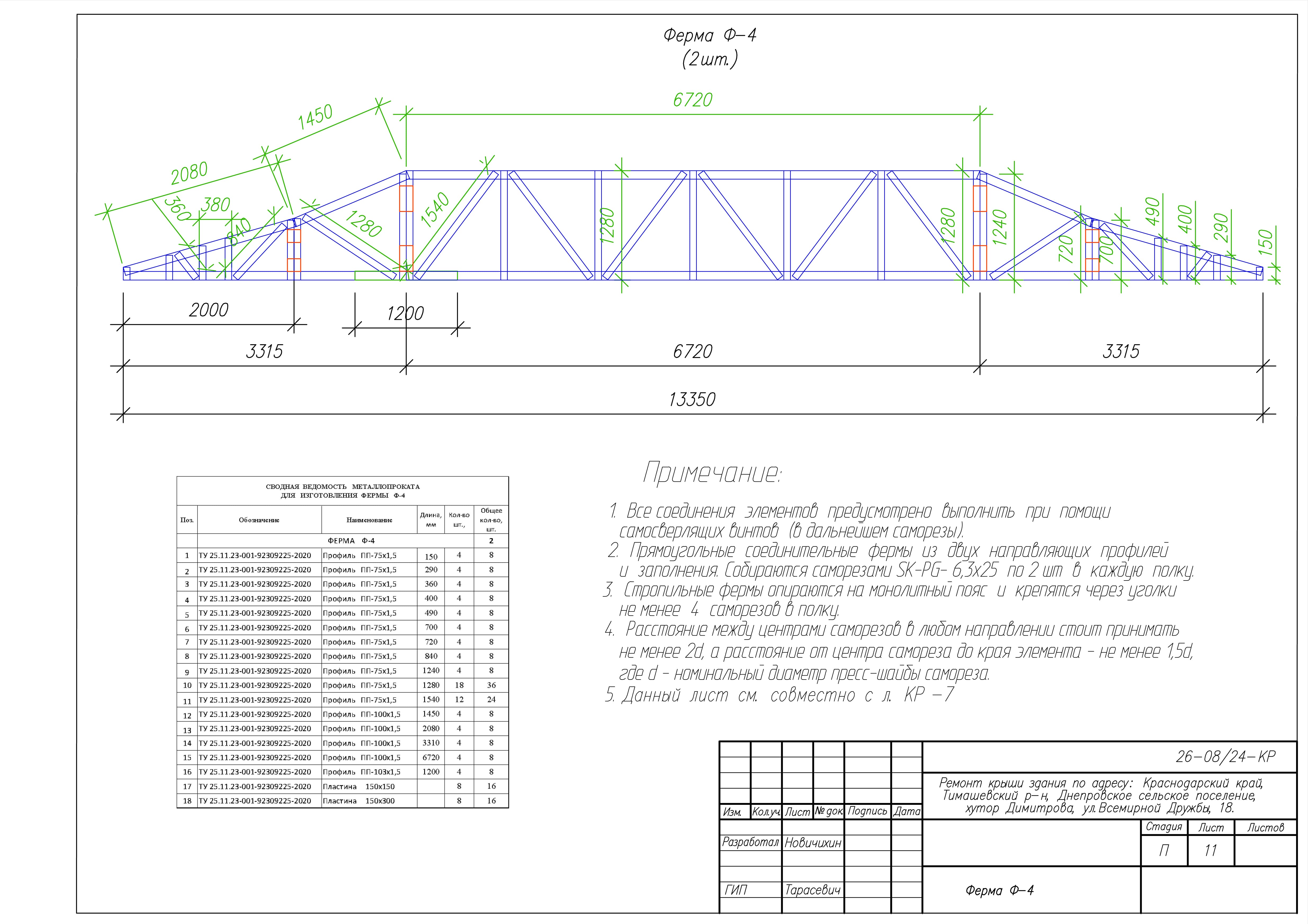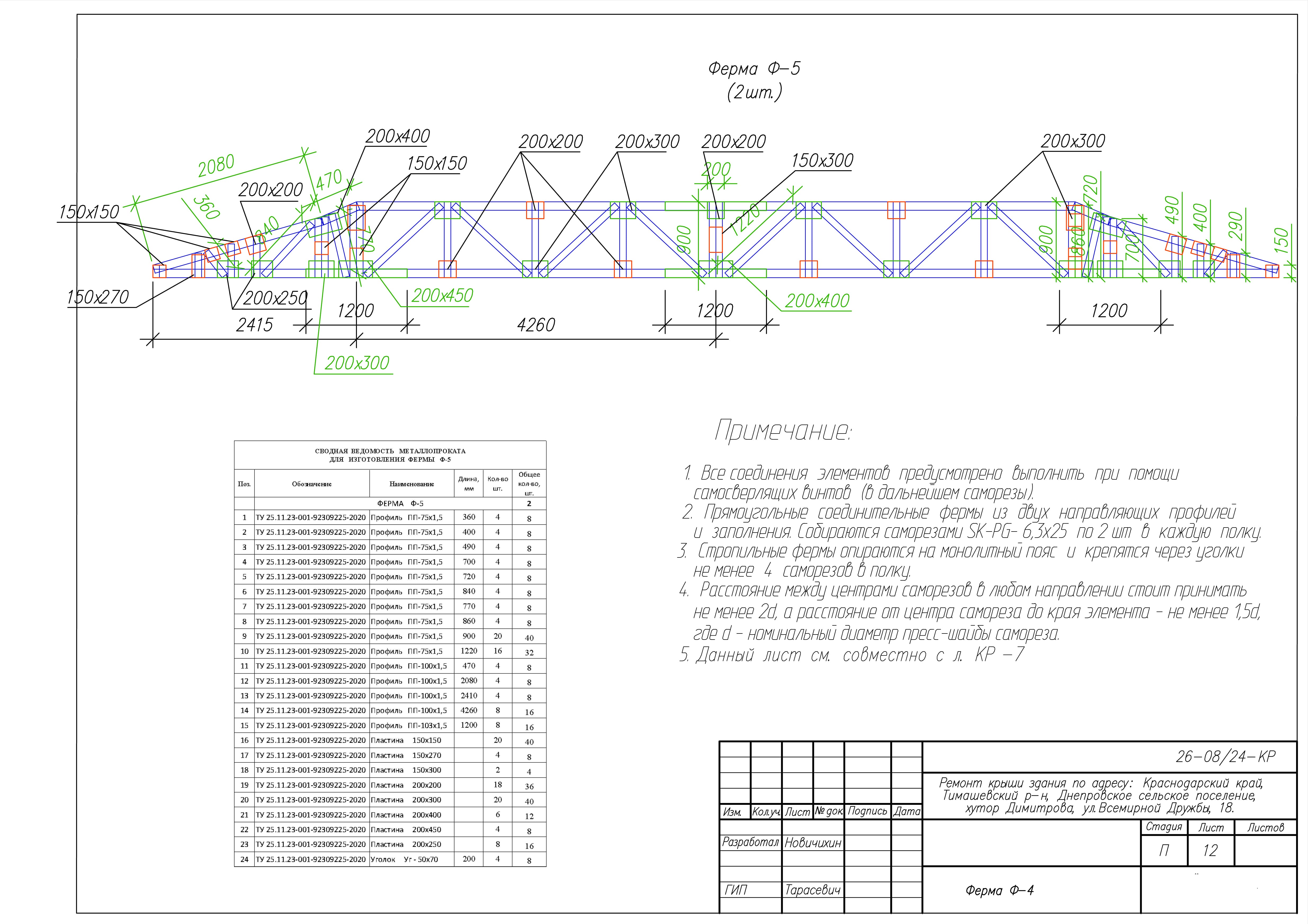 Представленные выше чертежи взяты из КМ к ремонту крыши здания по адресу: Краснодарский край, Тимашевский р-н, Днепровское сельское поселение, хутор Димитрова, ул.Всемирной Дружбы, 18. Замена старой кровельной конструкции на каркас из ЛСТК.