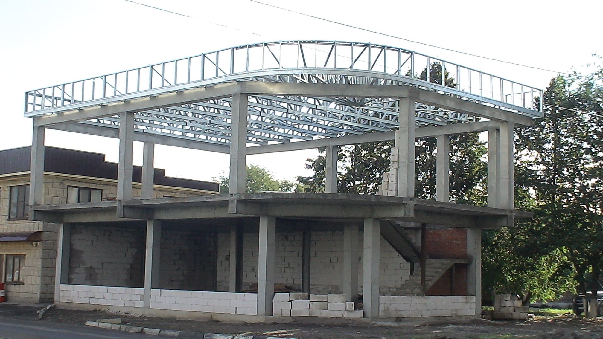 Строительство кровли из ЛСТК по улице Луначарского, г. Армавир, Краснодарский край. Применение оцинкованных профилей позволяет выполнить любые архитектурные формы в том числе и закруглённые на фронтонах кровли. Фермы из профилей несут повышенную снеговую нагрузку при минимальных уклонах кровли, что снижает её конечную стоимость.
