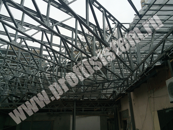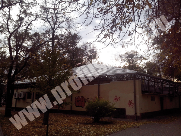 Монтаж кровли кафе в Ростове-на-Дону. Кровельная ЛСТК конструкция по улице Большая Садовая, Покровский сквер. Строительство кровли на данном объекте осложнялась тем, что фундаменты не позволяли опирать новую кровлю на существующие стены и перекрытие здания. В связи с чем пришлось смонтировать дополнительный метало-каркас на новых фундаментах, что позволило построить кровлю с большими пролётами не опираясь на старое здание.