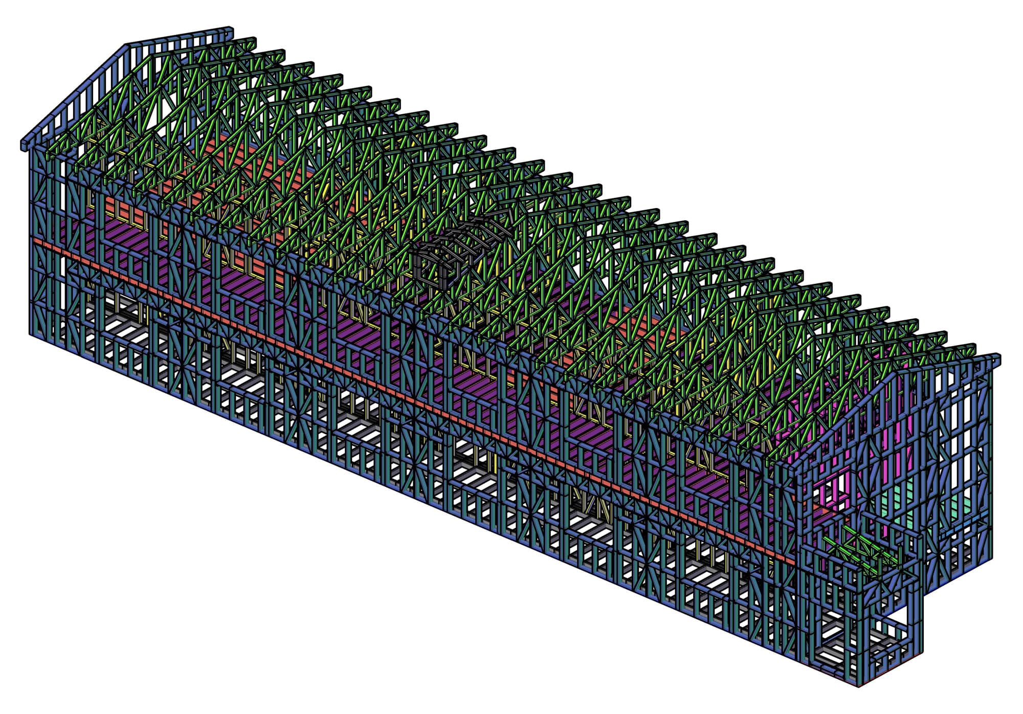 Перекрытие над вторым этажом — двускатные стропильные фермы. Обрешётка по верхнему поясу ферм с шагом 500 мм под металлические профилированные листы.
