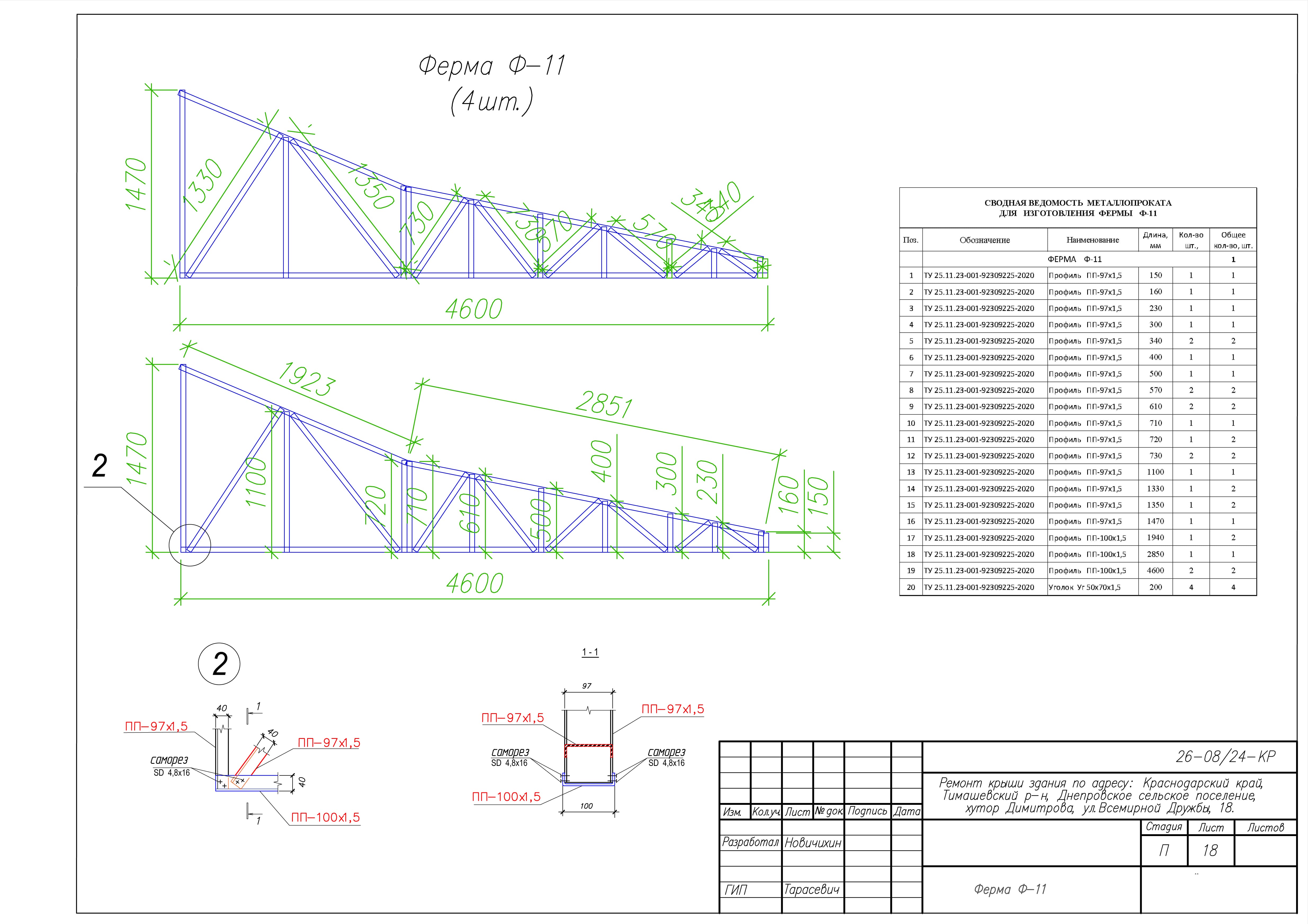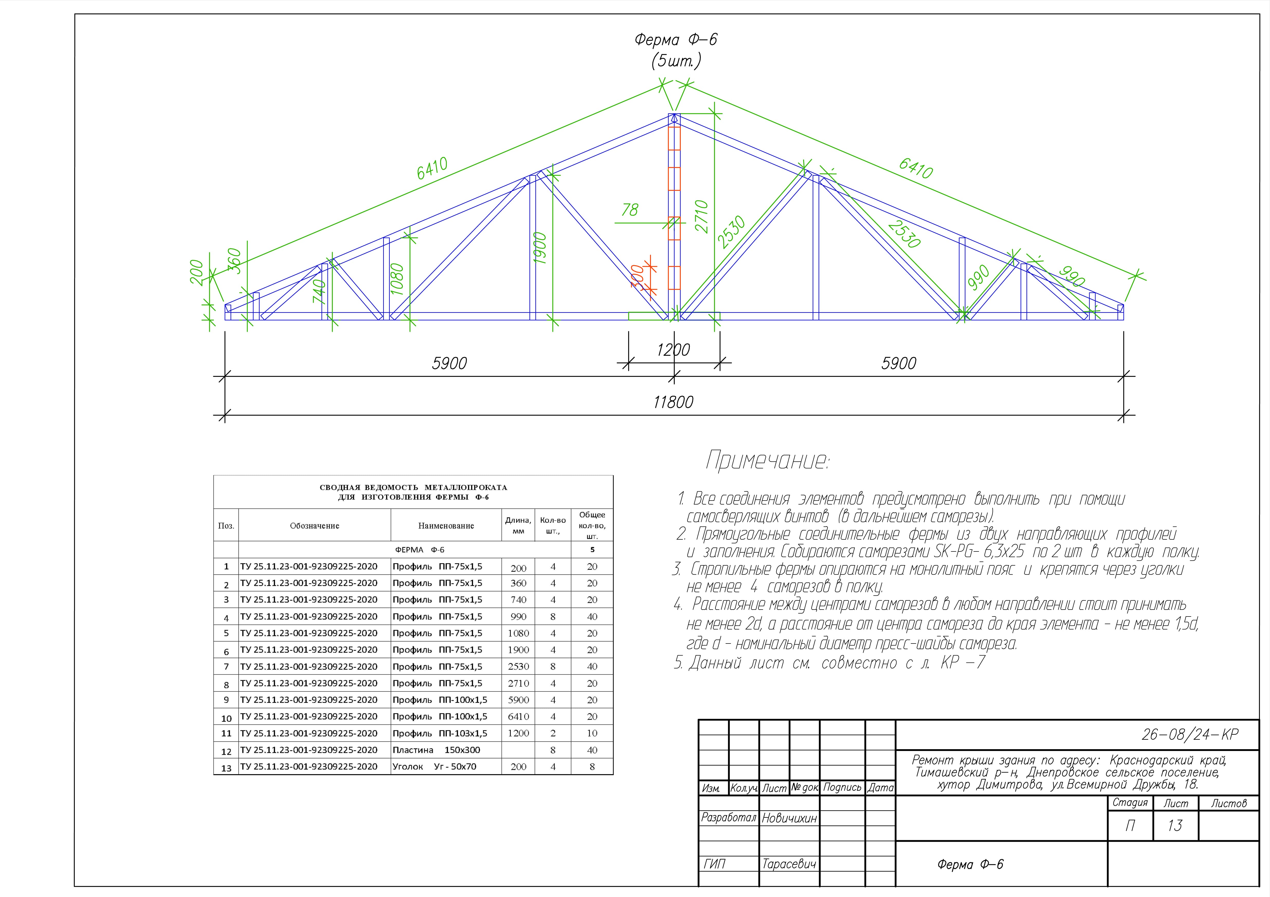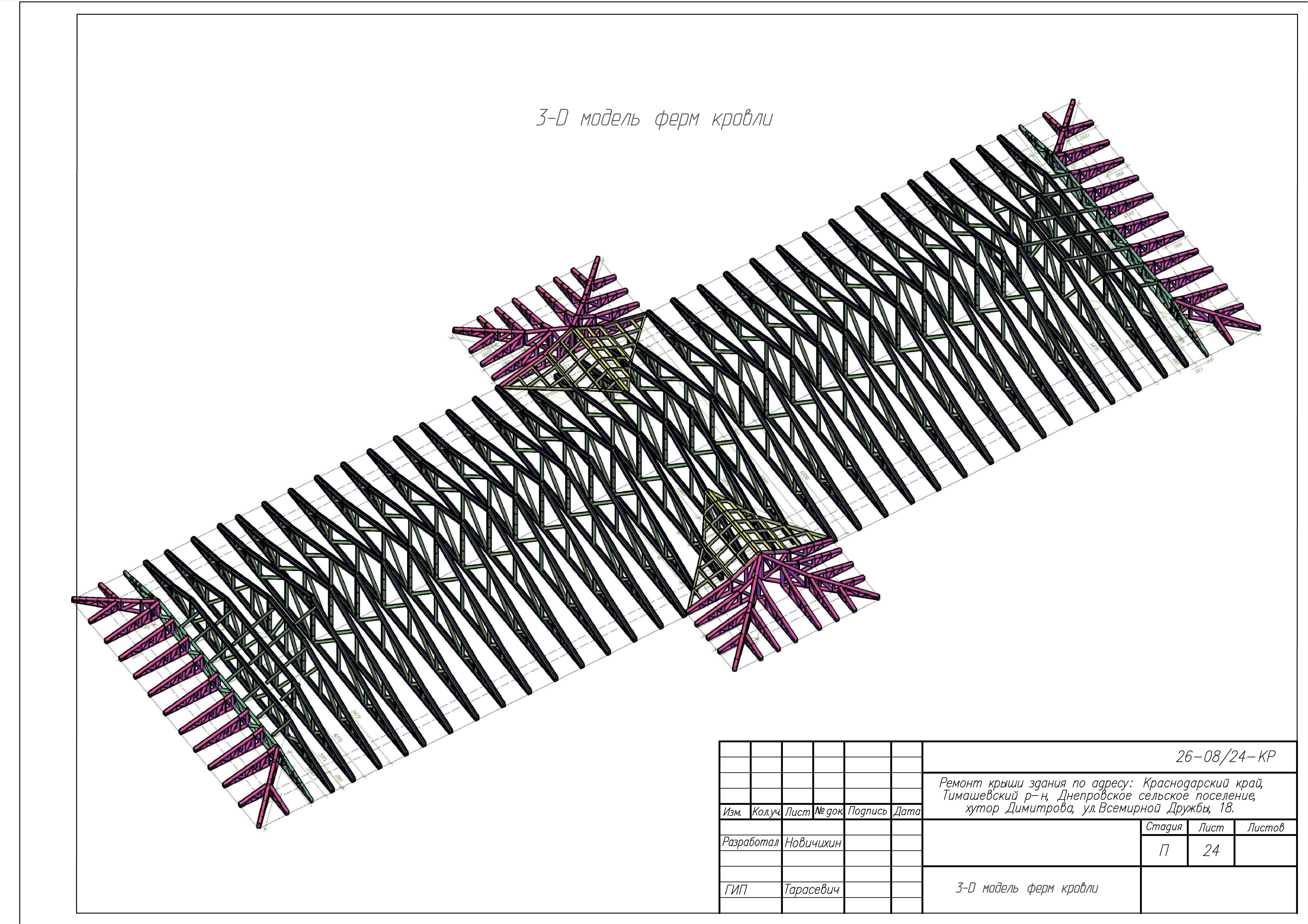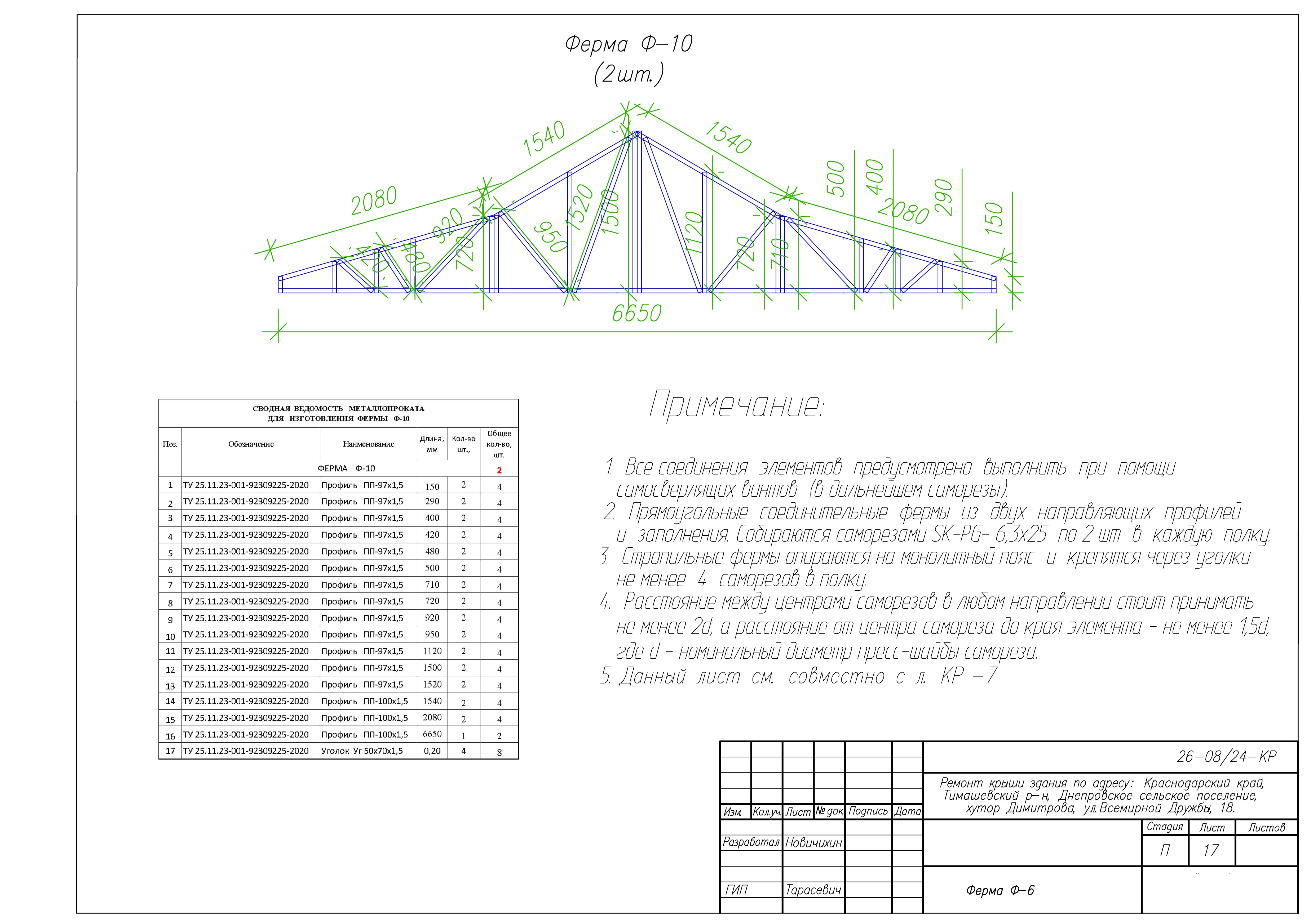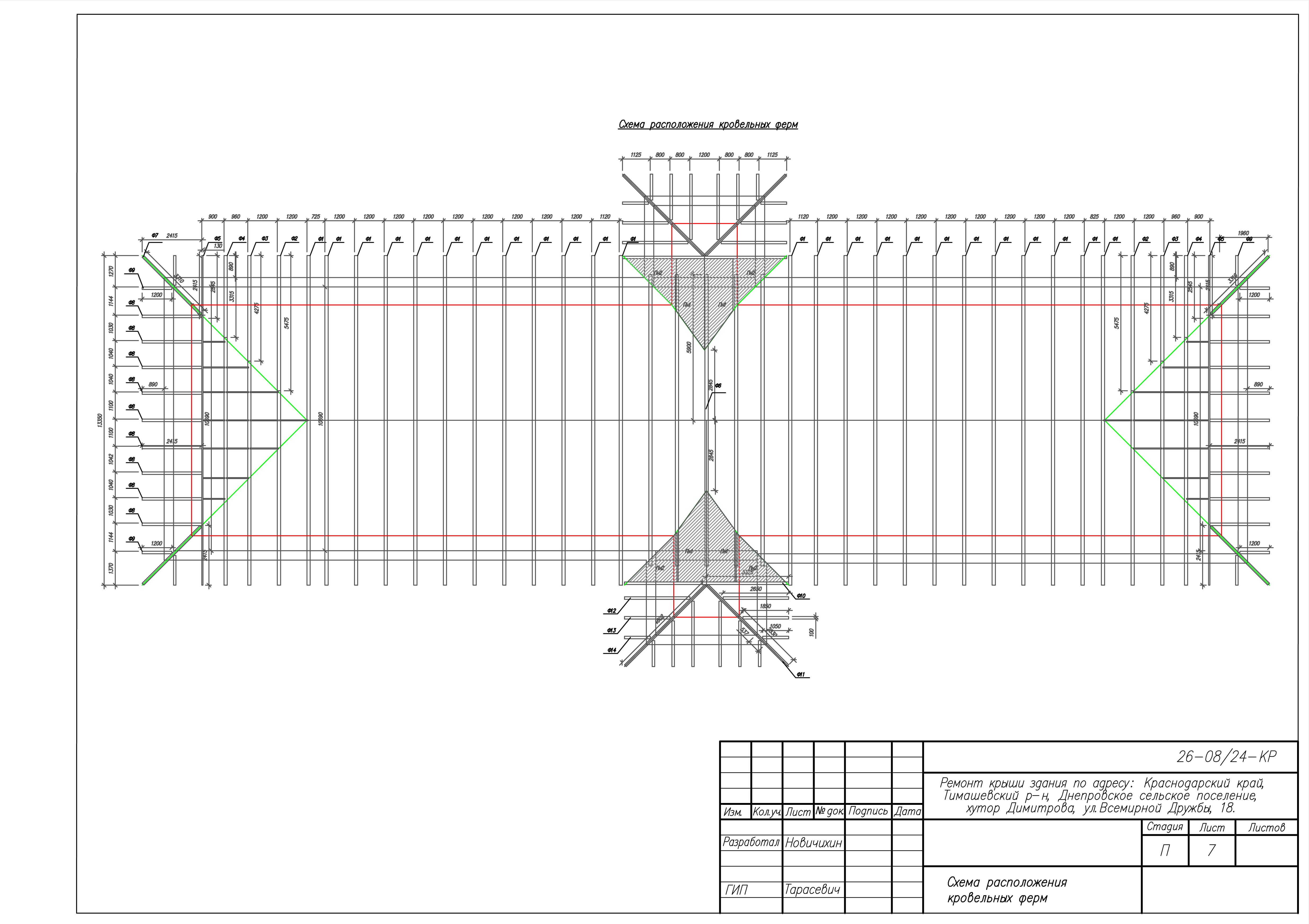 Представленные выше чертежи взяты из КМ к ремонту крыши здания по адресу: Краснодарский край, Тимашевский р-н, Днепровское сельское поселение, хутор Димитрова, ул.Всемирной Дружбы, 18. Замена старой кровельной конструкции на каркас из ЛСТК.