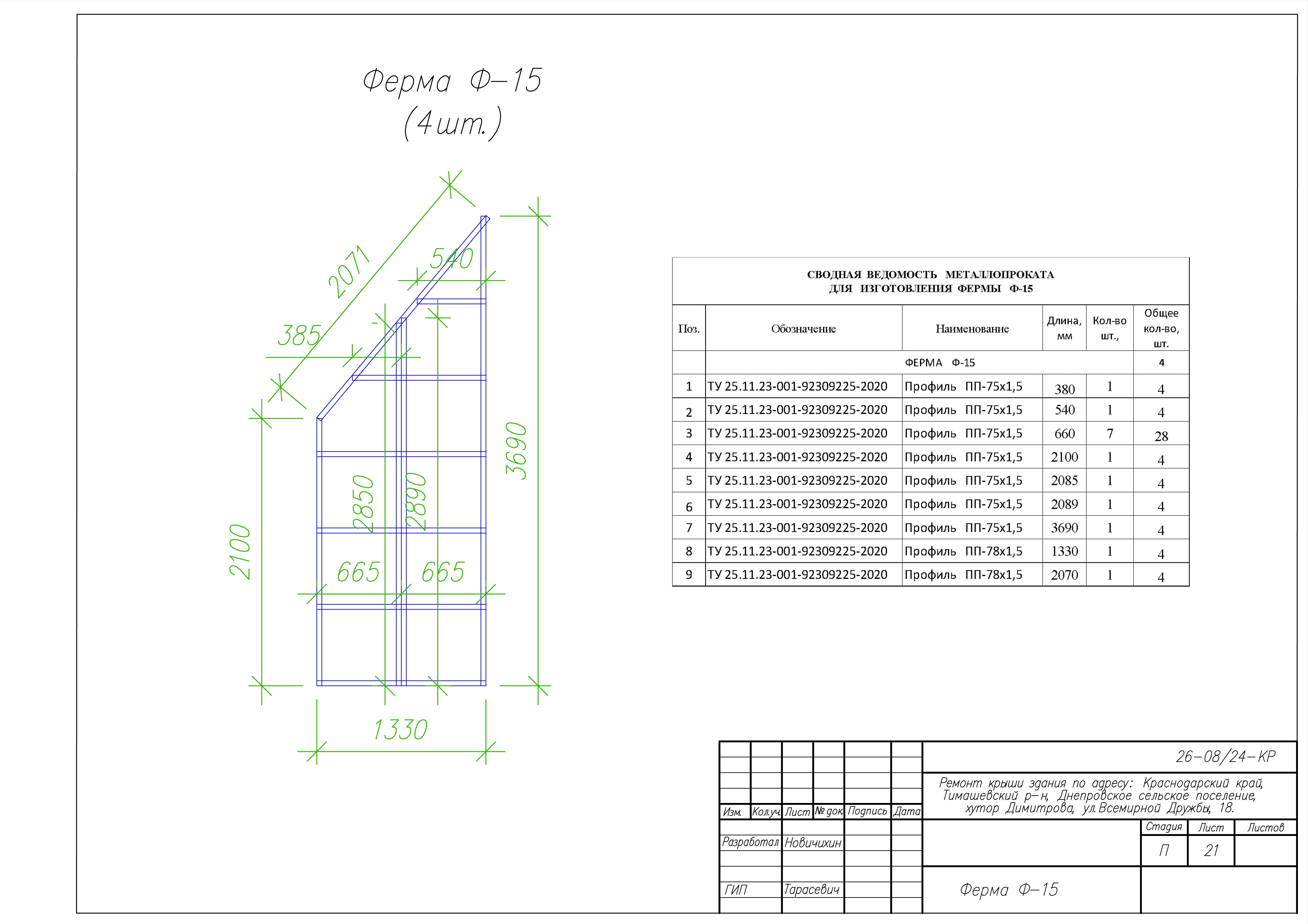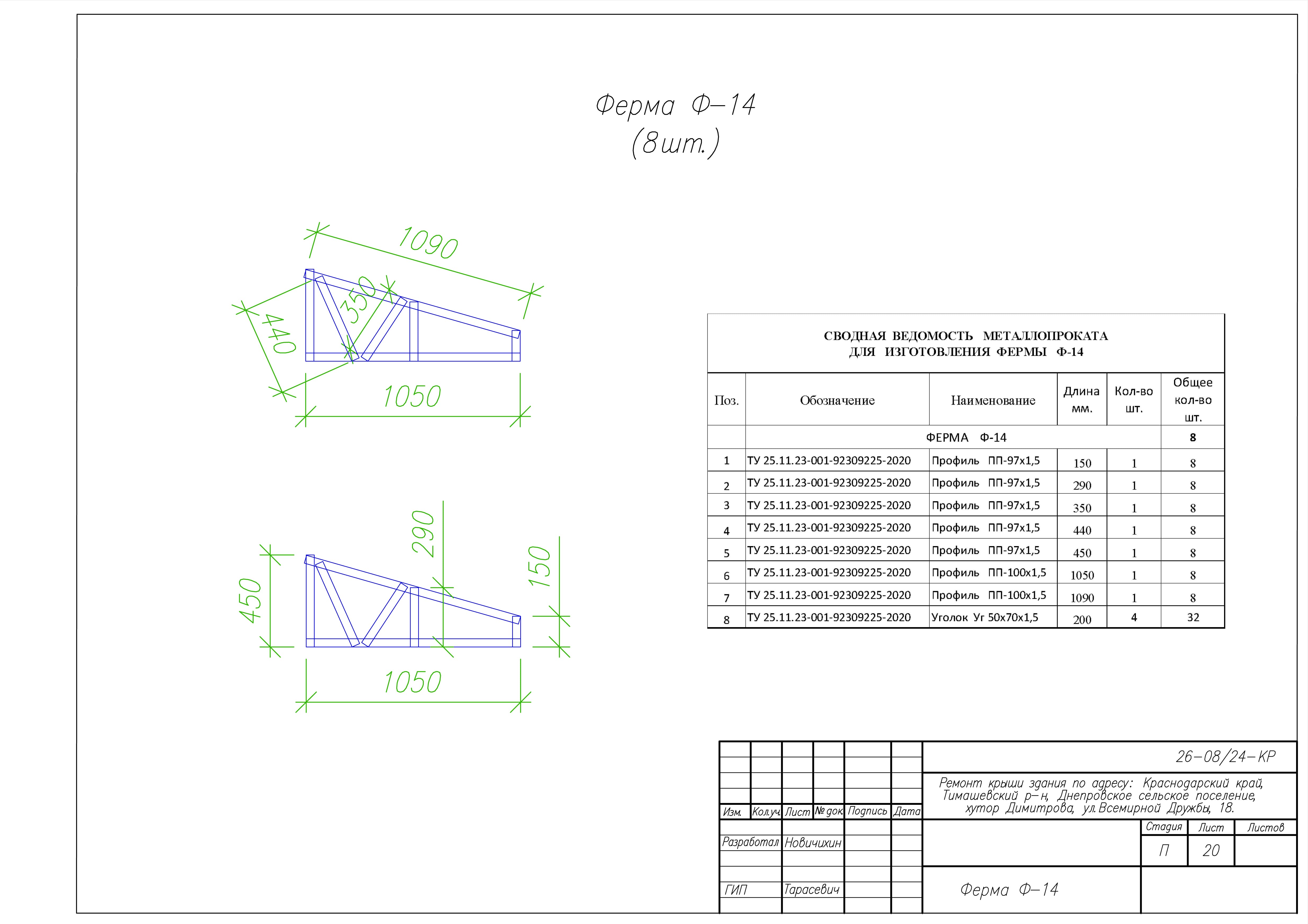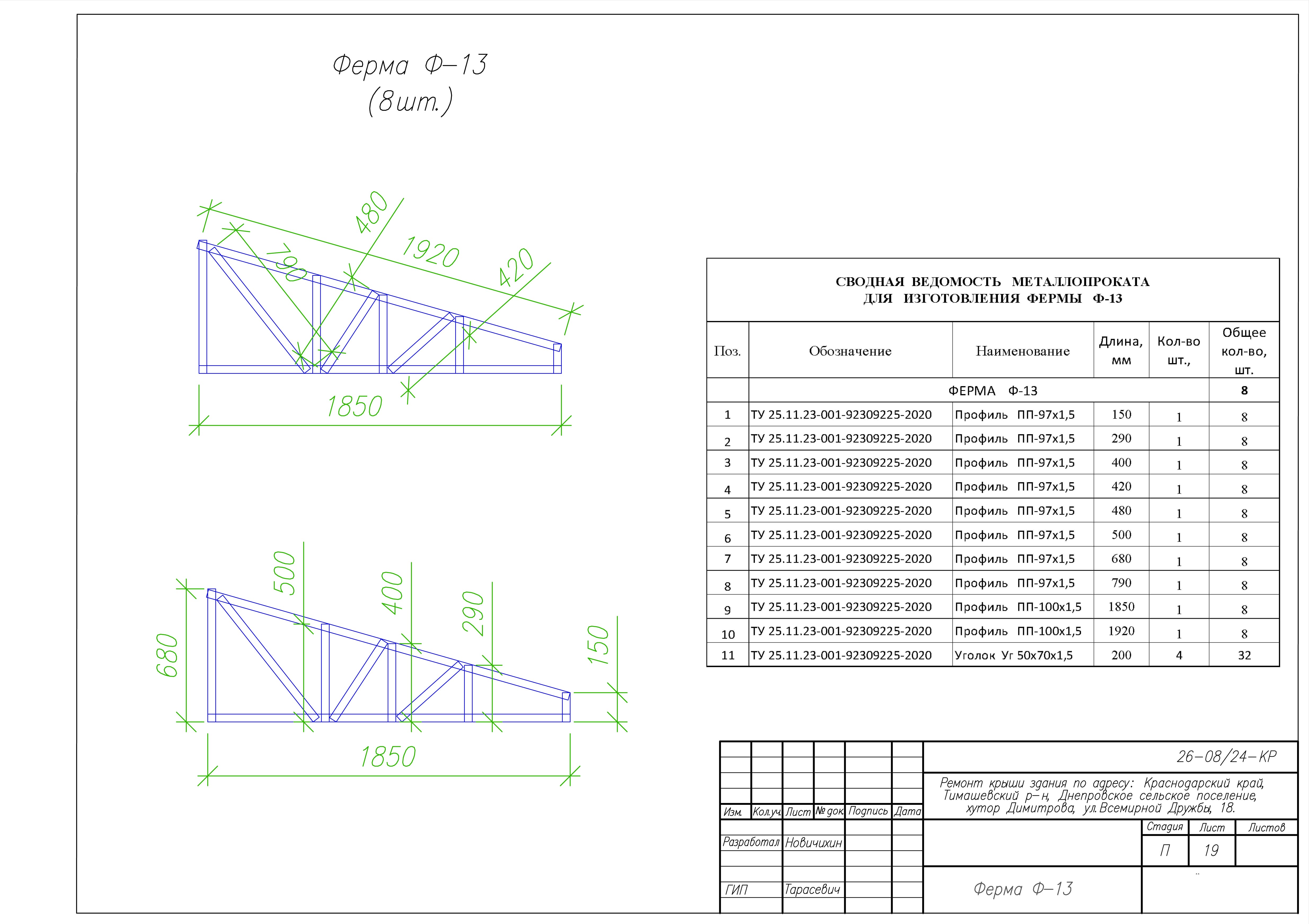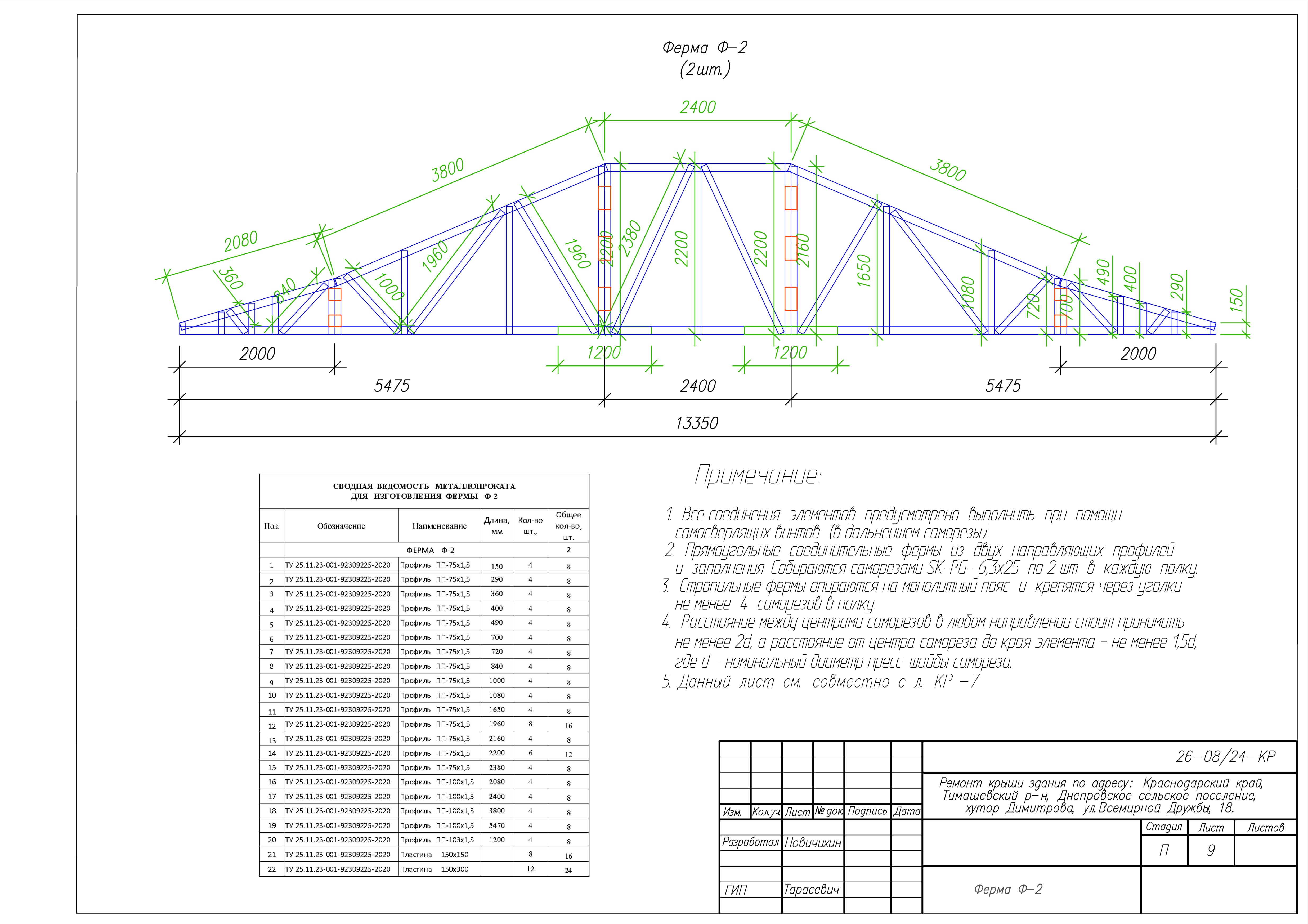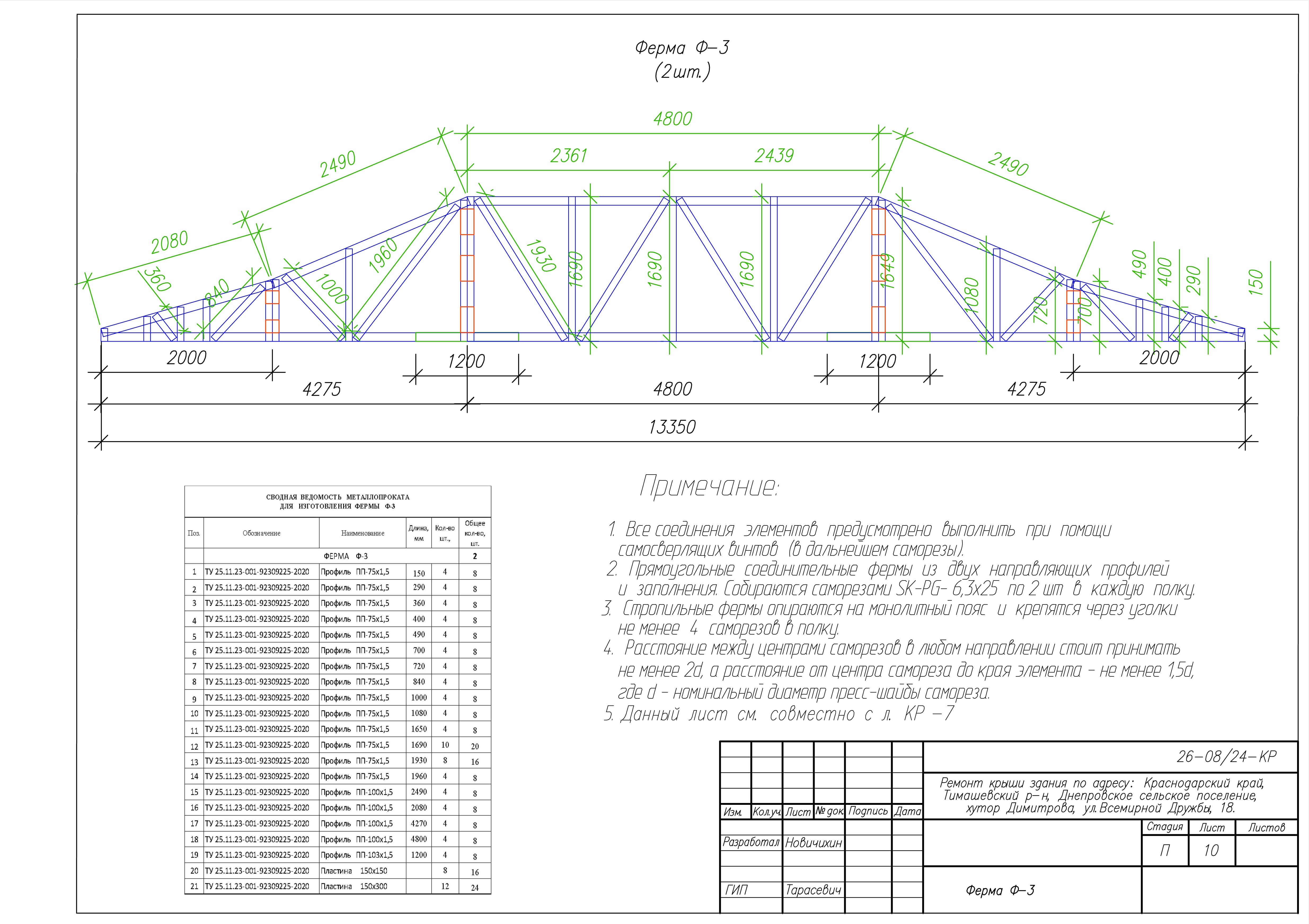 Представленные выше чертежи взяты из КМ к ремонту крыши здания по адресу: Краснодарский край, Тимашевский р-н, Днепровское сельское поселение, хутор Димитрова, ул.Всемирной Дружбы, 18. Замена старой кровельной конструкции на каркас из ЛСТК.