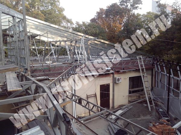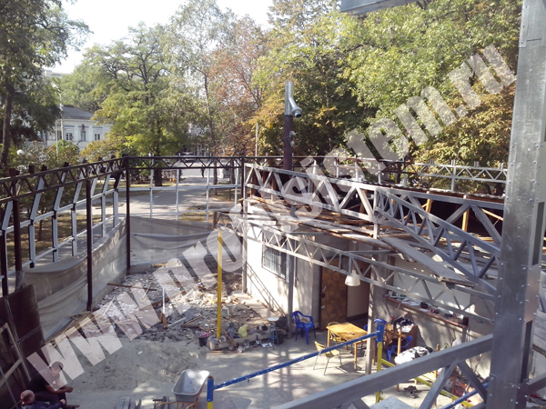 Монтаж кровли кафе в Ростове-на-Дону. Кровельная ЛСТК конструкция по улице Большая Садовая, Покровский сквер. Строительство кровли на данном объекте осложнялась тем, что фундаменты не позволяли опирать новую кровлю на существующие стены и перекрытие здания. В связи с чем пришлось смонтировать дополнительный метало-каркас на новых фундаментах, что позволило построить кровлю с большими пролётами не опираясь на старое здание.