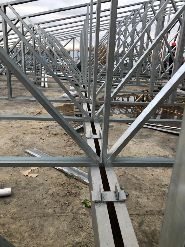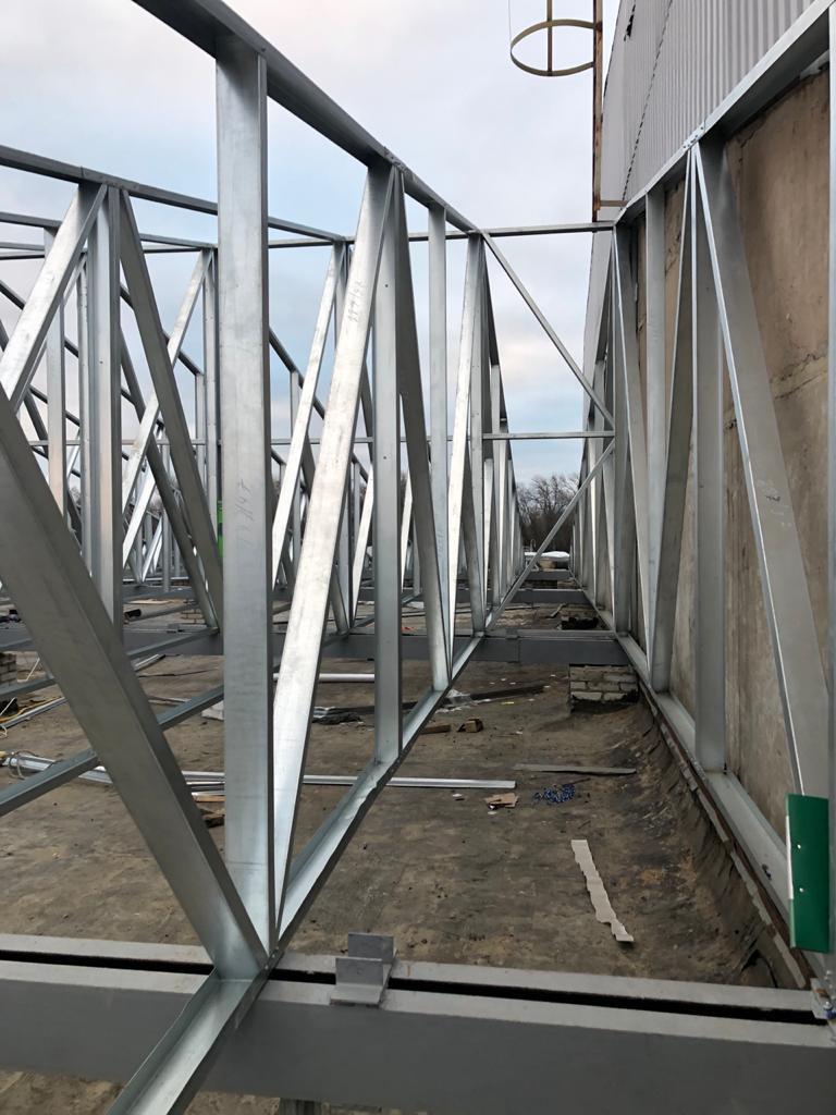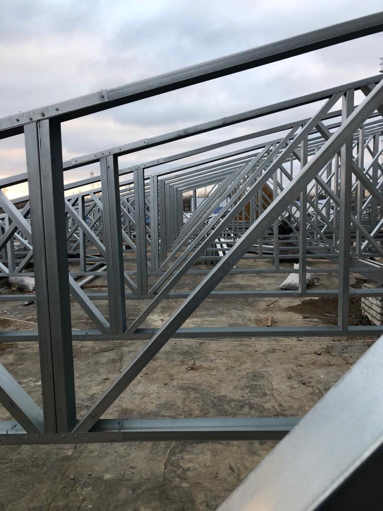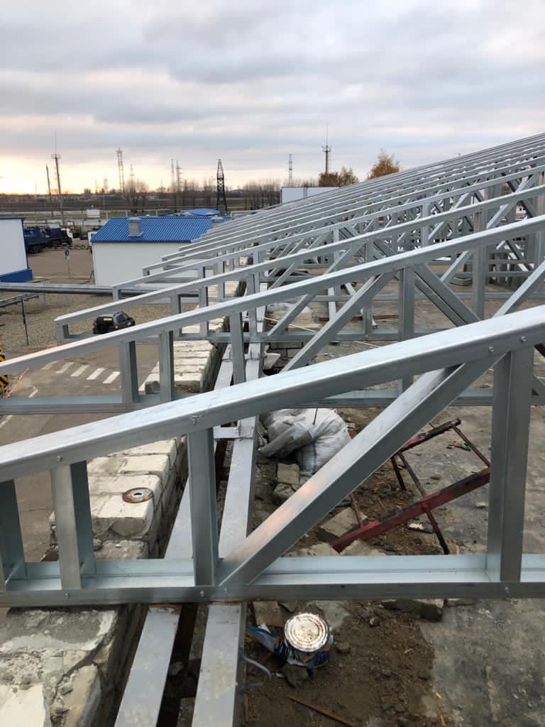 Ниже на фото, строительство ЛСТК кровли фермами в Тихорецке. Климатический район 3-Б; ветровой район 2 (СНКК 20-303-2002) расчётное значение 0,35 кПа; снеговой район 2, расчётное значение 1,2 кПа; зона влажности - сухая.